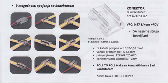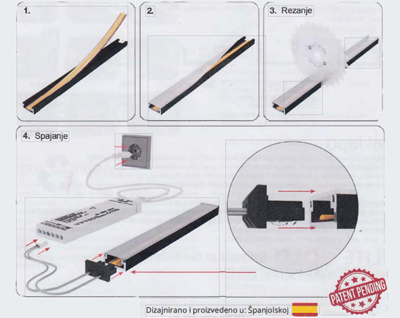 Sustav „Cut&Connect“ – omogućuje rezanje profila i LED trake u željenom mjestu (bez obzira na standardne točke rezanja) i spajanje putem integrirane završne kapice s priključnim kabelom – sve bez lemljenja.
