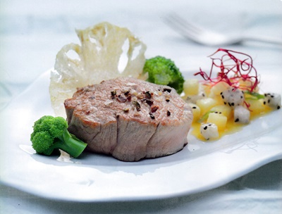 Začinite teleći odrezak Himalajskom soli Mediteran i ispržite u maslinovom ulju dok ne postane sočan. Pospite Paprom za steak.